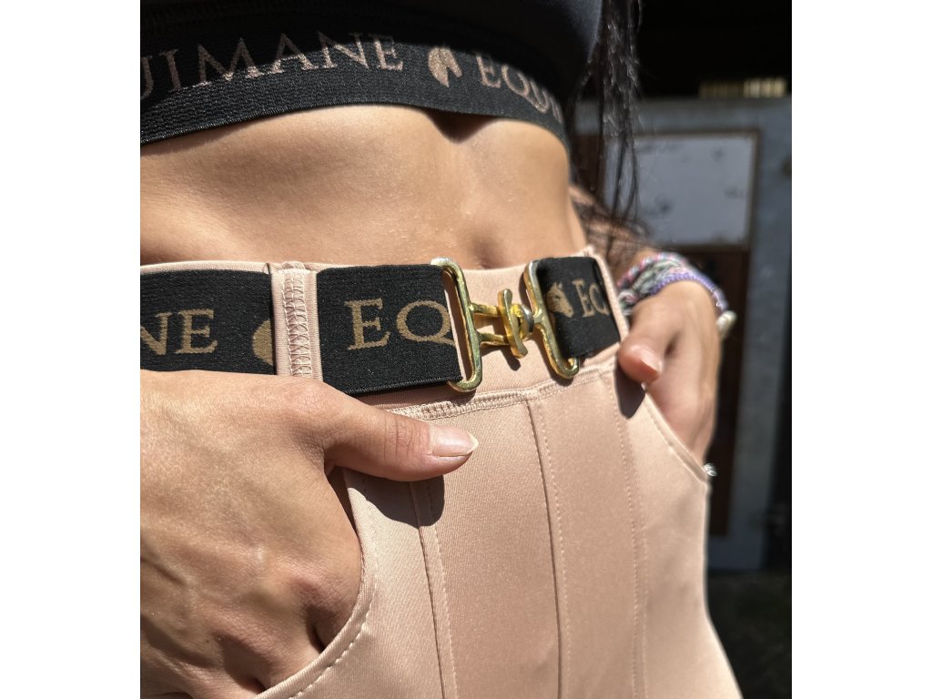 Náš jezdecký pásek - Equimane se dokonale hodí k legínám kolekce Deluxe. Je velmi pružný a nastavitelný, takže padne opravdu každému. Originální kovová spona designu Equimane ve zlatém provedení dává pásku jedinečný vzhled.