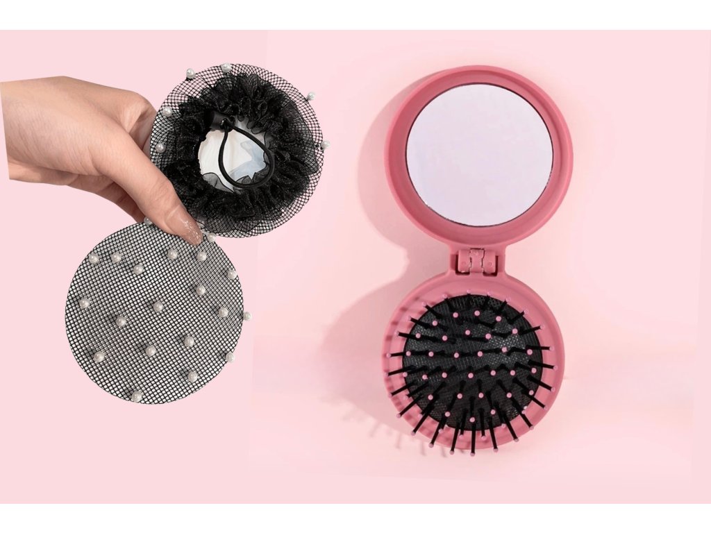 Kapesní hřeben se zrcátkem + síťka do vlasů s perličkami.